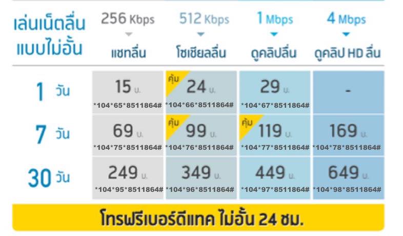 โปรเน็ต dtac รายวัน ความเร็ว 256Kbps แชทลื่น 15 บาท/1วัน สมัครกด*104*65*8511864#โทรออก . โปรเน็ต dtac รายวัน ความเร็ว 512Kbps โซเชียลลื่น 24 บาท/1วัน สมัครกด*104*66*8511864#โทรออก . โปรเน็ต dtac รายวัน ความเร็ว 4Mbps โซเชียลลื่น 29 บาท/1วัน สมัครกด*104*67*8511864#โทรออก . โปรเน็ต dtac รายสัปดาห์ ความเร็ว 256Kbps แชทลื่น 69 บาท/7วัน สมัครกด*104*75*8511864#โทรออก . โปรเน็ต dtac รายสัปดาห์ ความเร็ว 512Kbps โซเชียลลื่น 99 บาท/7วัน สมัครกด*104*76*8511864#โทรออก . โปรเน็ต dtac รายสัปดาห์ ความเร็ว 1Mbps ดูคลิปลื่น 119 บาท/7 วัน สมัครกด*104*77*8511864#โทรออก . โปรเน็ต dtac รายสัปดาห์ ความเร็ว 4Mbps ดูคลิปHDลื่น 169 บาท/7 วัน สมัครกด*104*78*8511864#โทรออก . โปรเน็ต dtac รายเดือน ความเร็ว 256Kbps แชทลื่น 249 บาท/30 วัน สมัครกด*104*95*8511864#โทรออก . โปรเน็ต dtac รายเดือน ความเร็ว 512Kbps โซเชียลลื่น 349 บาท/30 วัน สมัครกด*104*96*8511864#โทรออก . โปรเน็ต dtac รายเดือน ความเร็ว 1Mbps ดูคลิปลื่น 449 บาท/30 วัน สมัครกด*104*97*8511864#โทรออก . โปรเน็ต dtac รายเดือน ความเร็ว 4Mbps ดูคลิปHDลื่น 649 บาท/30 วัน สมัครกด*104*98*8511864#โทรออก