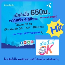 เน็ต ดีแทค ราคา 650 บาท / เดือน เน็ตสปีด 4 เมก