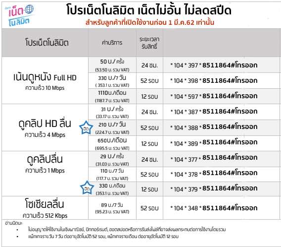 เน็ตดีแทค ไม่อั้น เน้นดูหนัง Full HD ความเร็ว 10 Mbps รายละเอียด:[b/] - ค่าสมัคร 50 บ.(53.50 บ. รวม VAT) - ระยะเวลาใช้งาน 24 ชม. สมัครกด*104*397*8511864#โทรออก[b/] - ค่าสมัคร 330 บ.(353.1 บ. รวม VAT) - ระยะเวลาใช้งาน 7 วัน สมัครกด*104*398*8511864#โทรออก[b/] - ค่าสมัคร 1,110บ.(1,187.7 บ. รวม VAT) - ระยะเวลาใช้งาน 30 วั สมัครกด*104*597*8511864#โทรออก[b/]  เน็ตดีแทค ไม่อั้น ดูคลิป HD ลื่น ความเร็ว 4 Mbps รายละเอียด:[b/] - ค่าสมัคร 31 บ.(33.17 บ. รวม VAT) - ระยะเวลใช้งาน 24 ชม. สมัครกด*104*387*8511864#โทรออก[b/] - ค่าสมัคร 210 บ.(224.7 บ. รวม VAT) - ระยะเวลาใช้งาน 7 วัน สมัครกด*104*388*8511864#โทรออก[b/] - ค่าสมัคร 650บ.(695.5 บ. รวม VAT) - ระยะเวลาใช้งาน 30 วัน สมัครกด*104*389*8511864#โทรออก[b/]  เน็ตดีแทค ไม่อั้น ดูคลิปลื่น ความเร็ว 1 Mbps รายละเอียด:[b/] - ค่าสมัคร 29 บ.(31.03 บ. รวม VAT) - ระยะเวลาใช้งาน 24 ชม. สมัครกด*104*377*8511864#โทรออก[b/] - ค่าสมัคร 110 บ.(117.7 บ. รวม VAT) - ระยะเวลาใช้งาน 7 วัน สมัครกด*104*378*8511864#โทรออก[b/] - ค่าสมัคร 330 บ.(353.1 บ. รวม VAT) - ระยะเวลาใช้งาน 30 วัน สมัครกด*104*379*8511864#โทรออก[b/]  เน็ตดีแทค ไม่อั้น โซเชียลลื่น ความเร็ว 512 Kbps รายละเอียด:[b/] - ค่าสมัคร 89 บ.(95.23 บ. รวม VAT) - ระยะเวลาใช้งาน 7 วัน สมัครกด*104*348 *8511864#โทรออก[b/]