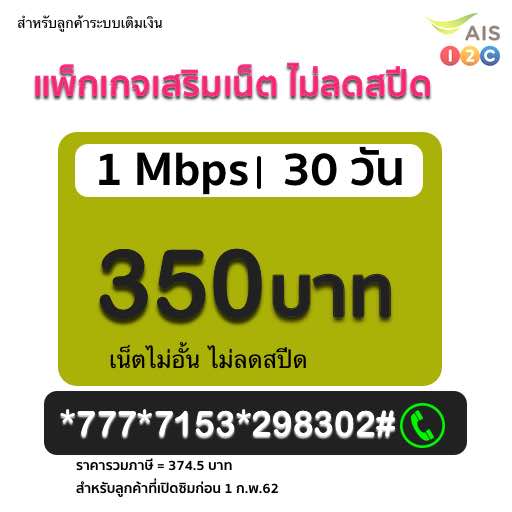 แพ็กเกจเน็ต AIS วันทูคอล เน็ตไม่อั้น ความเร็ว 1 Mbps ไม่ลดสปีดตลอดระยะเวลา 30 วัน 350 บาท สมัครกด*777*7153*298302#โทรออก