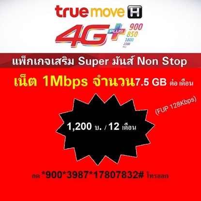 เน็ต ทรูมูฟเอช 1,200 บาท / ปี รายละเอียด -ใช้งานเน็ต ทรูมูฟเอช 4G/3G ความเร็วสูงสุด 1 Mbps ใช้งานได้ปริมาณเน็ต 7.5 GB ต่อ 1 เดือน +เน็ตไม่จำกัดความเร็ว 128 Kbps -ใช้งานยาวต่อเนื่อง 1 ปี หรือ 12 เดือน -ราคาจ่ายครั้งเดียว 1,200 บาท -เช็คเงินใหัครบก่อน ทำการกดสมัคร สมัครกด *900*3987*17807832# โทรออก