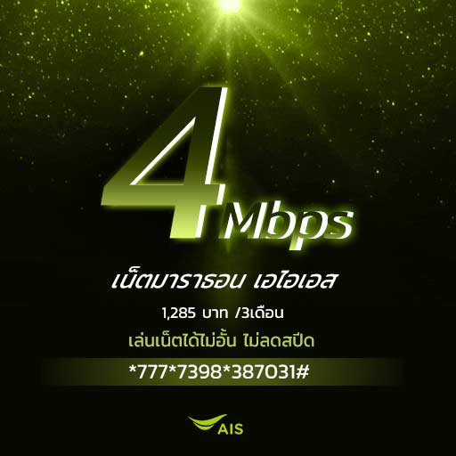 สำหรับลูกค้าเก่าที่เปิดซิมก่อน 1ก.พ.62เท่านั้น เน็ตมาราธอนเอไอเอส AISเน็ตความเร็ว 4Mbps ค่าสมัครบริการ 1285บาท ใช้งานได้ 3เดือน ***สมัครกด*777*7398*387031#โทรออก รายละเอียดโปรโมชั่น: -ใช้เน็ต3G/4G ไม่ลดสปีดได้ไม่อั้น ความเร็วสูงสุด 4Mbps -ค่าสมัครบริการ 1285บาท (ราคารวมภาษีแล้ว) -ระยะเวลาใช้งาน 3เดือน