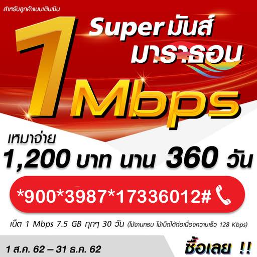 สมัครได้ทุกซิม  เน็ตทรูซุปเปอร์มันส์ มาราธอน เหมาจ่าย 1,200 บาท เล่นได้ 360 วัน เน็ต 7.5 GB ความเร็วสูงสุด 1 Mbps ทุก ๆ 30 วัน สมัครกด*900*3987*17336012#โทรออก รายละเอียด: - ชำระค่าบริการครั้งแรกเพียงครั้งเดียว 1,200 บาท เล่นได้ 360 วัน - ได้เน็ตเร็ว 1 Mbps 7.5 GB ทุก ๆ 30 วัน - หลังจากใช้ปริมาณเน็ตความเร็วสูงสุด 1 Mbps ครบตามปริมาณในแพ็กเกจแล้ว ยังสามารถใช้งานเน็ตต่อเนื่องได้ที่ความเร็วสูงสุด 128Kbps - ค่าสมัคร 1,200 บาท(รวมภาษีแล้ว)