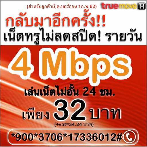 เน็ตทรูไม่ลดสปีด 4 Mbps 32 บาท เล่นเน็ตได้ไม่อั้น 1 วัน สม้ครกด*900*3706*17336012#โทรออก