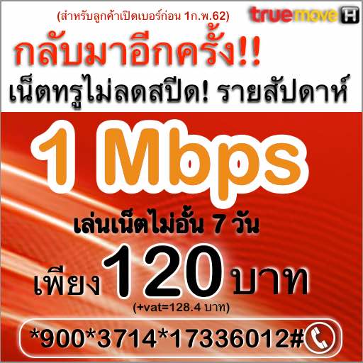 สำหรับลูกค้าที่เปิดเบอร์ก่อน 1 ก.พ.62 เท่านั้น  เน็ตทรูไม่ลดสปีด 1 Mbps 120 บาท เล่นเน็ตได้ไม่อั้น 7 วัน สมัครกด*900*3714*17336012#โทรออก