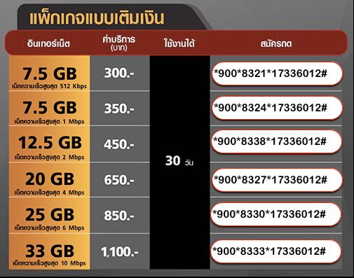 เน็ต 35 GB ราคา 1,100 บาท 30 วัน ความเร็วสูงสุด 10 Mbps สมัครกด*900*8333*17336012#โทรออก