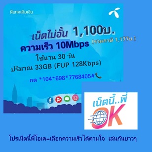 โปรเน็ต ดีแทค 30 วัน 1,100 บาท [สมัครได้ทั้งซิมเก่าและซิมใหม่] รายละเอียด -ใช้งานอินเตอร์เน็ต ดีแทค ความเร็ว 10 Mbps ปริมาณ 33 GB พร้อมใช้งานเน็ตไม่อั้น 128 Kbps -ใช้งานนาน 30 วัน -ราคา ค่าบริการ 1,100 บาท -สมัครได้ทั้งซิมเก่าและซิมใหม่ สมัครกด *104*698*7768405# โทรออก