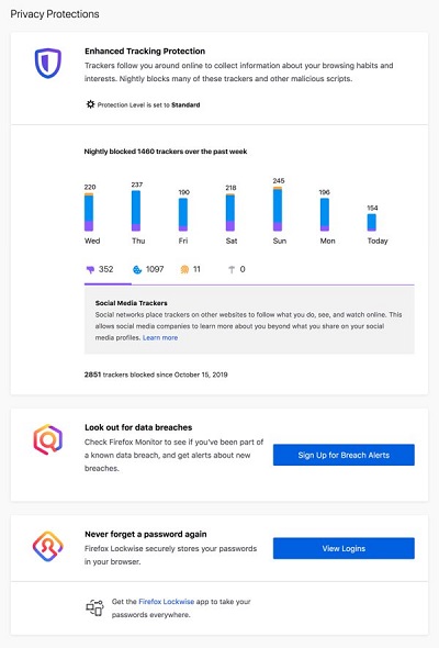 - ดูว่า Enhanced Tracking Protection บล็อกความพยายามติดตามผู้ใช้ด้วยคุกกี้เป็นจำนวนกี่ครั้ง - หนึ่งในหลายวิธีที่ Firefox ช่วยให้ผู้ใช้ปลอดภัย แม้มองไม่เห็น ก็คือการบล็อกคุกกี้ติดตามของบุคคลที่ 3 ซึ่งวิธีนี้คือส่วนหนึ่งของ Enhanced Tracking Protection ซึ่ง Firefox เปิดตัวในรูปแบบการตั้งค่าอัตโนมัติตั้งแต่เมื่อเดือนกันยายน เพื่อช่วยป้องกันไม่ให้บุคคลที่ 3 สร้างโปรไฟล์ผู้ใช้จากฐานข้อมูลกิจกรรมออนไลน์ของพวกเขา โดยปัจจุบันผู้ใช้จะสามารถเห็นจำนวนผู้ติดตามข้ามเว็บไซต์และโซเชียลมีเดีย ผู้พิมพ์ลายนิ้วมือ และนักขุดคริปโตที่เราบล็อกในนามของผู้ใช้ - อัพเดทตลอดว่ามีข้อมูลรั่วไหลหรือไม่ด้วย Firefox Monitor - ข้อมูลรั่วไหลไม่ใช่เรื่องปกติ ดังนั้นการดูแลบัญชีผู้ใช้และรหัสผ่านอีเมลจึงมีความสำคัญมากยิ่งกว่าที่เคย ปัจจุบันผู้ใช้สามารถอ่านรายงานสรุปเกี่ยวกับพาสเวิร์ดที่ไม่ปลอดภัย ซึ่งอาจถูกนำไปใช้ในการเจาะข้อมูล ด้วยเหตุนี้ พวกเขาจึงสามารถอัพเดทและเปลี่ยนแปลงรหัสผ่านเหล่านั้นได้ - จัดการรหัสผ่านและซิงก์อุปกรณ์ด้วย Firefox Lockwise - ปัจจุบันผู้ใช้สามารถดูคร่าว ๆ ถึงประวัติการเซฟพาสเวิร์ดด้วย Firefox Lockwise ขณะเดียวกัน Firefox ยังเพิ่มปุ่มที่ผู้ใช้สามารถคลิกดูการล็อกอินและการอัพเดทของตนเอง โดยที่ผู้ใช้ยังสามารถดูและจัดการกับอุปกรณ์ต่าง ๆ ที่ซิงก์และแชร์รหัสผ่านร่วมกันด้วย