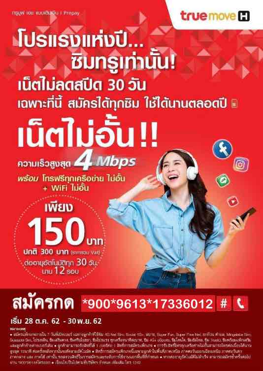 เน็ตทรูรายเดือน 150 บาท(รวมภาษีแล้ว) เน็ตไม่อั้น 4 Mbps + โทรฟรีทุกเครือข่าย + Wifi ไม่อั้น 24 ชม. ต่ออายุให้อัตโนมัติ นาน 12 เดือน สำหรับลูกค้าเปิดเบอร์ใหม่ซิมเติมเงิน พื้้นที่ภาคเหนือ ภาคตะวันออกเฉียงเหนือ ภาคตะวันตก ภาคกลาง และ ภาคใต้  รับสิทธิ์สมัครโปรเน็ตทรูรายเดือน 150 บาท เน็ตไม่ลดสปีด 4 Mbps +โทรฟรีทุกค่ายไม่อั้น กดสมัครภายใน 7 วัน นับจากวันที่ลงทะเบียนซิมเท่านั้น! สมัครกด*900*9613*17336012#โทรออก