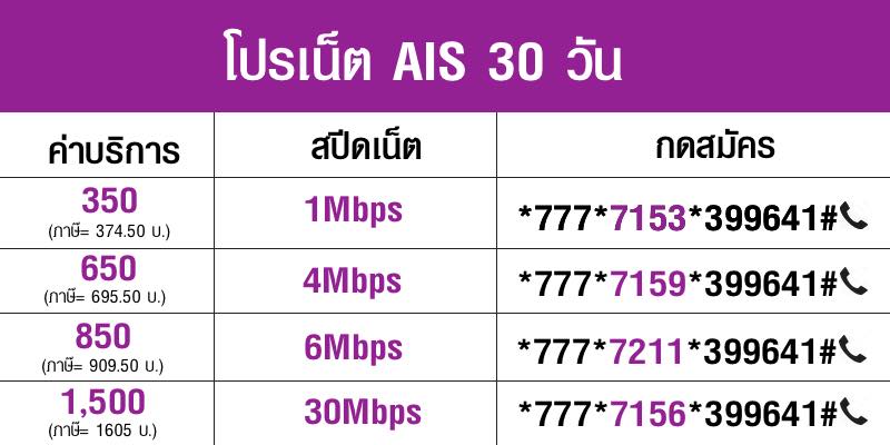 โปรเน็ต AIS 30 วัน เน็ตไม่อั้นไม่ลดสปีด 350บ. 650บ.850บ. 1500บ.
