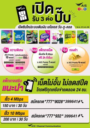เน็ต AIS เปิดซิมใหม่ เเน็ต 10Mbps เดือน ละ 200 บาทและ เน็ต 4Mbps 150 บาท พ.ย.62 [เปิดซิมใหม่]