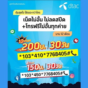 โปรเปิดซิมดีแทคใหม่ 200 บาท ความเร็วสูงสุด 10Mbps ไม่ลดสปีด ใช้งานได้ไม่อั้น ไม่จำกัดปริมาณ +โทรฟรีไม่อั้นทุกค่าย ใช้งาน 30 วัน (แต่ละรอบ) ต่ออายุอัตโนมัติ รวม 12 รอบ กดสมัคร *103*410*7768405# โทรออก
