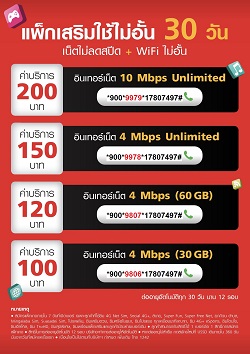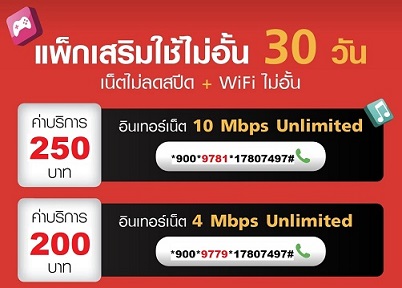 แพ็กเสริมใช้ไม่อั้น 30 วัน เน็ตไม่ลดสปีด + WiFi ไม่อั้น