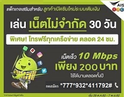 ใหม่!! แพ็กเกจเสริมสำหรับ ลูกค้าเปิดวิมเติมเงิน และ ย้ายค่ายมาระบบเติมเงินเอไอเอส เน็ตไม่จำกัด 10 Mbps ราคา 200 บาท ขยายเวลาสมัครได้ถึง 30 พฤศจิกายน 2562 หรือจนกว่าจะมีการเปลี่ยนแปลง