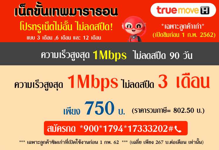 โปรเน็ต ทรูมูฟเอส 1 Mbps 3 เดือน 90 วัน ไม่อั้น ไม่ลดสปีด สำหรับซิมเก่าที่เปิดใช้ ก่อน 1 กพ.62 เท่านั้น สมัครเลย ค่าบริการ เพียง 750 บาท ( รวมค่าภาษี 802.50 บาท ) สมัครกด *900*1794*17333202#โทรออก