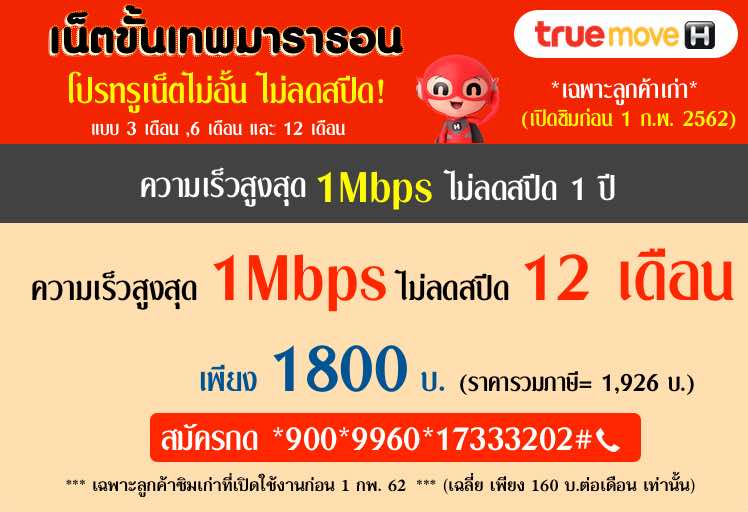 โปรเน็ต ทรูมูฟเอส 1 Mbps 12 เดือน 1 ปี ไม่อั้น ไม่ลดสปีด สำหรับซิมเก่าที่เปิดใช้ ก่อน 1 กพ.62 เท่านั้น สมัครเลย ค่าบริการ เพียง 1800 บาท ( รวมค่าภาษี1926.00 บาท ) สมัครกด *900*9960*17333285#โทรออก