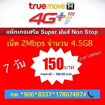 หมายเหตุ : - สมัครแพ็กเกจภายใน 7 วันที่เปิดเบอร์ เฉพาะลูกค้าที่ใช้ซิม 4G NET SIM, Social 4g+ , สบาย , Super Fun , Super Free Net , ยกก๊วน ตำบล , Mangalaba sim , Suasadei sim , โปรเพลิน , ซิมเสริมดวง , ซิมศรีอโยธยา , ซิมโปรแรง ทุกเครื่องนาทีละบาท , ซิม 4G+ eSports , ซิมโดนใจ, ซิมฮัลโหล , ซิม TrueID, ซิมสุดพิเศษ , ซิมพร้อมแพ็กเกสริมและลูกค้าย้ายค่ายเบอร์เดิม