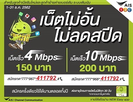 โปรเปิดซิมใหม่ราคา 150 บาท (รวม VAT) อินเทอร์เน็ต 4Mbps ไม่จำกัด ไม่อั้น ไม่ลดสปีด ใช้งานนาน 30 วัน ต่ออายุอัตโนมัตทุก 30 วัน กดสมัคร *777*967*411792# โทรออก
