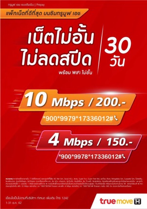 เน็ตทรูรายเดือน ไม่อั้น 4 Mbps นาน 30 วัน เพียง 150 บาท เท่านั้น!