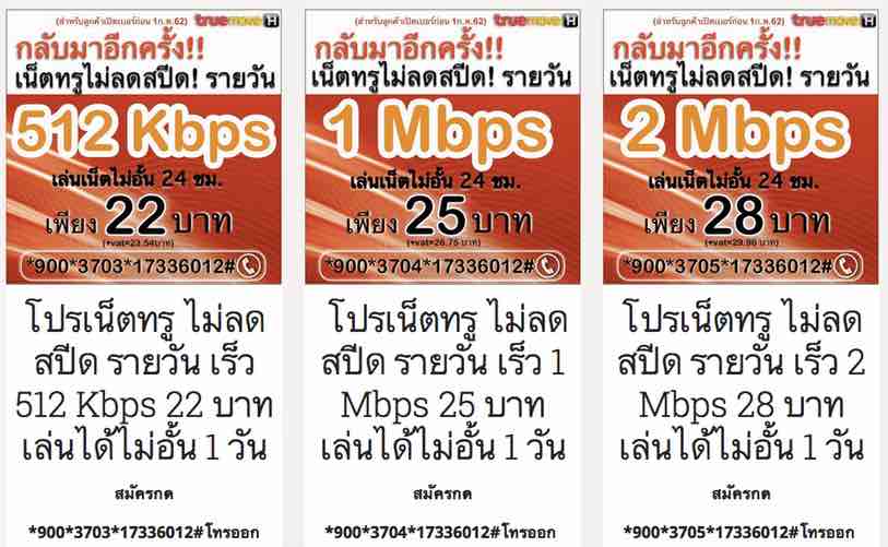 เน็ตทรูไม่อั้น ไม่ลดสปีด เน็ตรายวัน ความเร็ว 512 Kbps 22 บาท เล่นเน็ตได้ไม่อั้น 24 ชม. สมัครกด*900*3703*17336012#โทรออก
