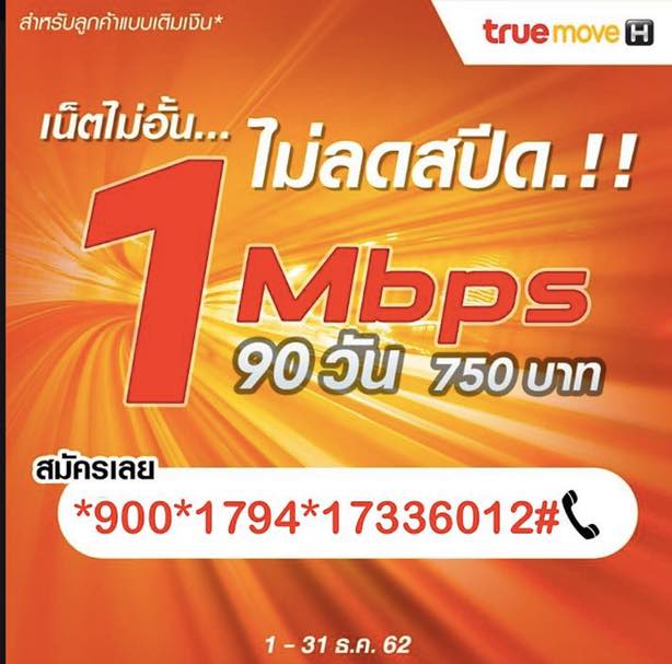 เน็ตทรูไม่ลดสปีด 1 Mbps 3 เดือน 750 บาท สมัครกด*900*1794*17336012#โทรออก