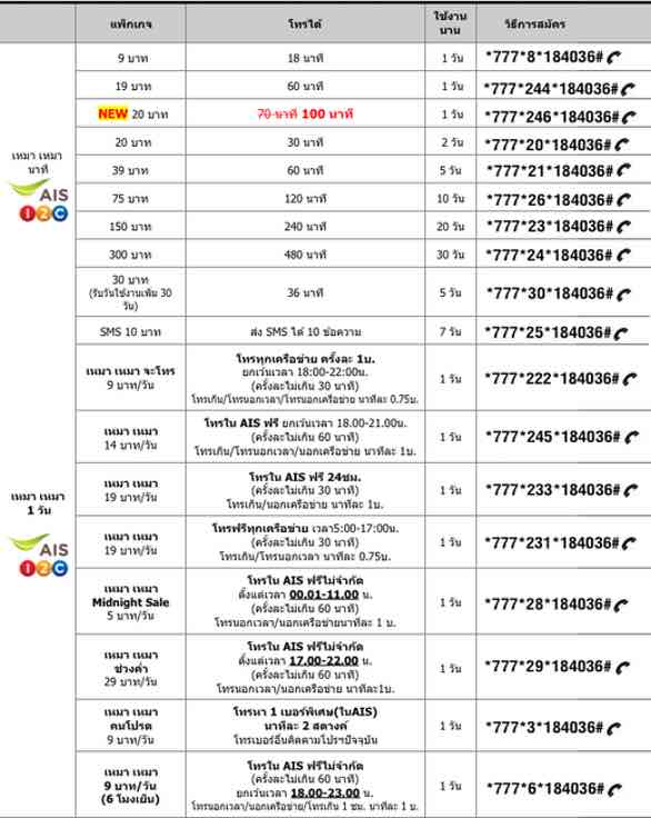 - AIS เหมา เหมา โทรฟรีทุกเครือข่าย 15 นาที 9 บาท/ 1วัน กด *777*8*184036# โทรออก - AIS เหมา เหมา ค่าโทร 60 นาที 19 บาท/ 1วัน กด *777*244*184036# โทรออก - AIS เหมา เหมา ค่าโทร 100 นาที 20 บาท/ 1วัน กด *777*246*184036# โทรออก - AIS เหมา เหมา ค่าโทร 30 นาที 20 บาท/ 2วัน กด *777*20*184036# โทรออก - AIS เหมา เหมา ค่าโทร 60 นาที 39 บาท/ 5 วัน กด *777*21*184036# โทรออก - AIS เหมา เหมา ค่าโทร 120 นาที 75 บาท/ 10 วัน กด *777*26*184036# โทรออก - AIS เหมา เหมา ค่าโทร 240 นาที 150 บาท/ 20 วัน กด *777*23*184036# โทรออก - AIS เหมา เหมา ค่าโทร 480 นาที 300 บาท/ 30 วัน กด *777*24*184036# โทรออก - AIS เหมา เหมา ค่าโทร 36 นาที 30 บาท/ 5 วัน กด *777*30*184036# โทรออก