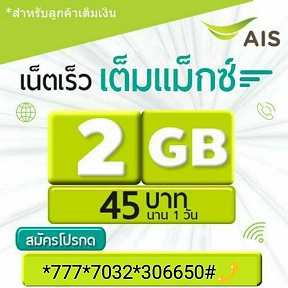 โปรเน็ต AIS รายวัน 45 บาท -ใช้งาน เน็ต AIS 4G/3G ความเร็วเต็มสปีด ปริมาณ 2 GB -ใชงาน รายวัน -ราคา 45 บาท รวมภาษี=48.15 บาท สมัครกด *777*7032*306650# โทรออก