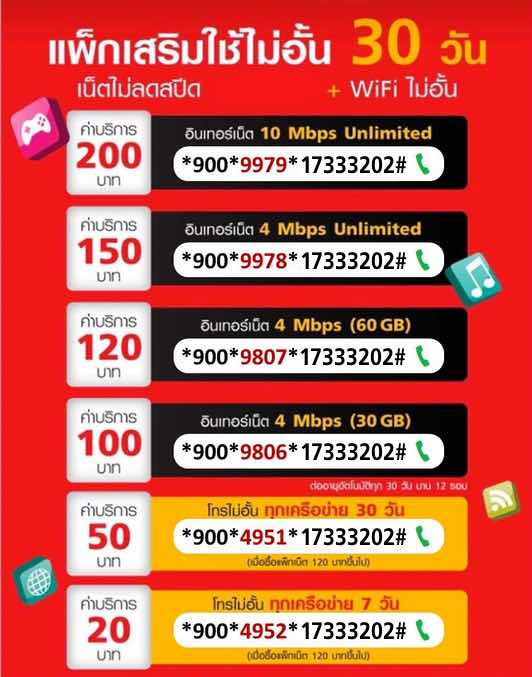 - แพคเกจ โทรไม่อั้น สามารถใช้โทรได้ติดต่อกันสูงสุด 15นาที หลังจากนั้นคิดค่าบริการส่วนเกินนาทีละ 69สต.