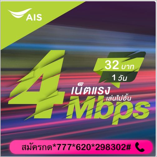 Updat! #โปรเน็ตAISรายวันไม่อั้น #เน็ตไม่ลดสปีดรายวัน #เน็ตไม่อั้น6Mbps #เน็ตไม่ลดสปีด1วัน สมัครได้ทุกซิมทั้งลูกค้าซิมเก่าและซิมใหม่  . เน็9คเอไอเอสรายวัน 32 บาท(+vat=34.24 บาท)เล่นเน็ตได้ไม่อั้น 4 Mbps นาน 24 ชม. สมัครกด *777*620*298302#โทรออก