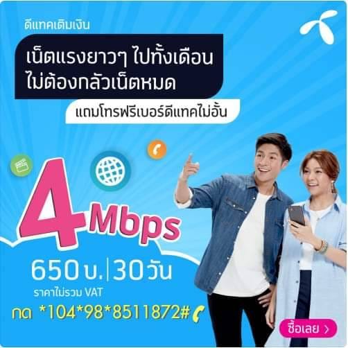 โปรเน็ต DTAC เน็ตดีแทค ไม่อั้น ใม่ลดสปีด 30 วัน ตวามเร็วสูงสุด 4 Mbps 30 วัน 1เดือน โทรฟรีเบอร์ดีแทค ไม่อั้น ค่าบริการเพียง 650 บาท( รวมภาษี 695.50 บาท) สมัครกด *104*98*8511872#โทรออก ( ใช้ซิมแบบเติมเงิน ) สมัครได้เลย