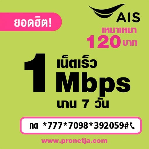 โปรเน็ต AIS รายสัปดาห์ เน็ตไม่อั้นไม่ลดสปีด 120 บาท แพ็กเน็ต AIS วันทูคอล เน็ตไม่อั้นความเร็ว 1Mbps ราคา 120 บาท (128.40 บาท) สมัครกด *777*7098*392059# โทรออก รายละเอียด แพ็กเหมาเน็ต AIS รายสัปดาห์ สำหรับลูกค้า AIS วันทูคอลที่เปิดใช้งานก่อน 1 ก.พ.2562 เท่านั้น ใช้งานเน็ตความเร็ว 1Mbps ไม่อั้น