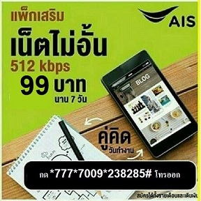 เน็ต ais 7 วัน 99 บาท เน็ตไม่ลดสปีด สมัครกด *777*7009*238285# โทรออก -เล่นเน็ต AIS 4G/3G ความเร็ว 512 Kbps เน็ตไม่ลดสปีด -ใช้งานนาน 7 วัน -ราคา 99 บาท รวมภาษี=105.93 บาท -สมัครได้ทุกซิม ทั้ง ซิมใหม่ และ ซิมเก่า AIS One 2 Call