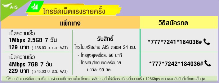 💚 โปรเน็ต AIS 7 วัน 129 บาท ใช้งานเน็ตได้ 2.5GB ความเร็ว 1Mbps รับสิทธิ์โทรฟรีในเครือข่าย AIS 24 ชม. ครั้งละ 60 นาที โทรเกิน/โทรนอกเครือข่ายนาทีละ 99 สต. ราคา 129 บาท ( 138.03 บ. รวมVAT) กดสมัคร *777*7241*184036# โทรออก