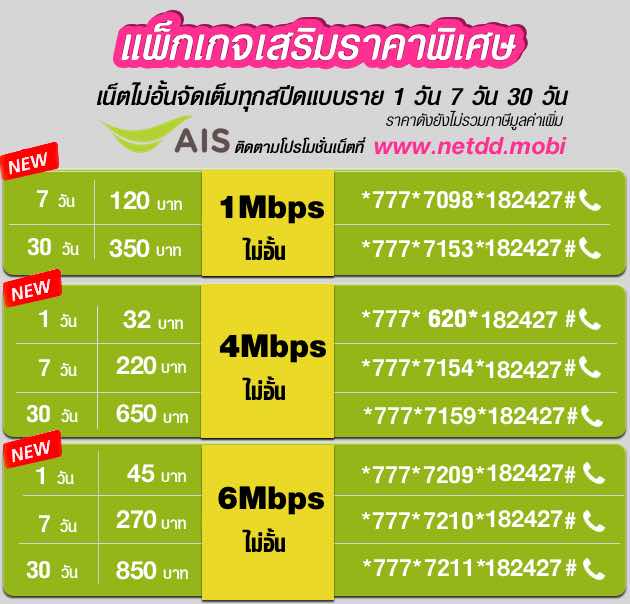 ✅ โปรเน็ต AIS วันทูคอล รายเดือน เน็ต AIS ไม่อั้นไม่ลดสปีด ความเร็ว 6Mbps ราคา 850 บาท (รวม Vat= 909.50 บ.) ระยะเวลาใช้งาน 30 วัน สมัครกด *777*7211*182427# โทรออก