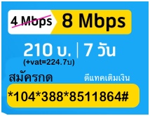 เน็ตดีแทครายสัปดาห์ ไม่อั้น เน็ตเพิ่ม 2 เท่า ราคาเดิม ความเร็ว 8 Mbps(จากเดิม 4 Mbps) 210 บาท(+vat=224.70บ.) ิสมัครกด*104*388*8511864#โทรออก