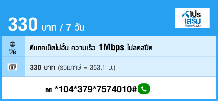 ✅ โปรเน็ตดีแทค 350 บาท รายเดือน เน็ตดีแทค ไม่อั้นไม่ลดสปีด ความเร็ว 1Mbps ราคา 350 บาท (รวม Vat= 353.1 บ.) ระยะเวลาใช้งาน 30 วัน สมัครกด *104*379*7574010# โทรออก