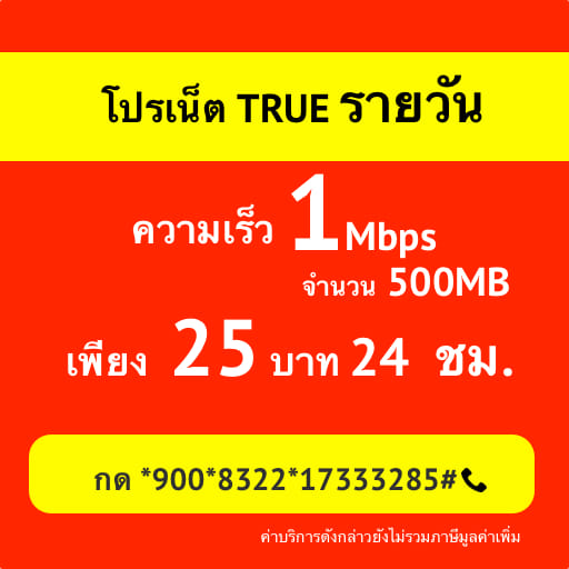 ปรเน็ต TRUE 1 วัน 24 ชั้วโมง ค่าบริการ เพียง 25 บาท จำนวน 500 MB สมัครกด *900*8322*17333285#โทรออก เน็ตใช้ตามปริมาณ เมื่อใช้ครบ ลดเหลือ 128Kbps