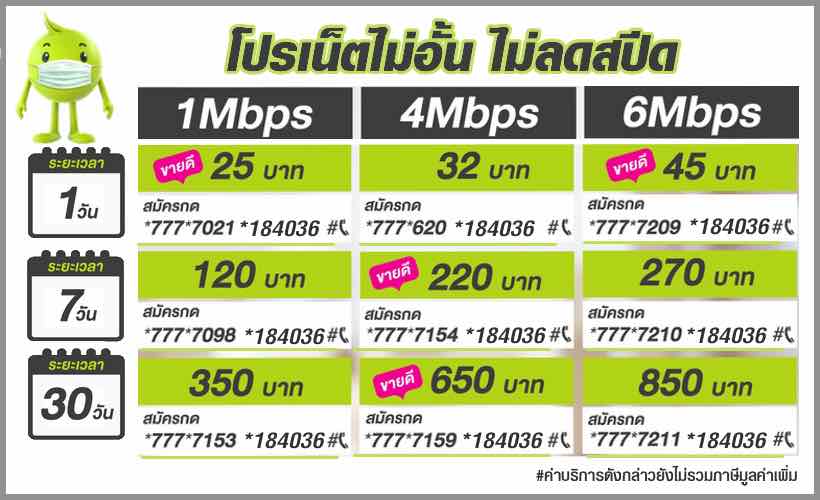 ✅ โปรเน็ต AIS วันทูคอล รายเดือน เน็ต AIS ไม่อั้นไม่ลดสปีด ความเร็ว 4Mbps ราคา 650 บาท (รวม Vat= 695.50 บ.) ระยะเวลาใช้งาน 30 วัน สมัครกด *777*7159*184036# โทรออก