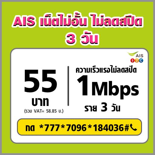 ใหม่ล่าสุด! โปรเน็ต AIS 55 บาท 3 วัน ความเร็ว 1Mbps ไม่อั้นไม่ลดสปีด โปรเน็ต AIS รายวัน 55 บาท เล่นแพ็กเน็ตได้ไม่อั้นไม่ลดสปีด ความเร็วสูงสุด 1Mbps กดสมัคร *777*7096*184036# โทรออก . รายละเอียด � โปรเสริม AIS วันทูคอลรายวัน เน็ตไม่อั้นไม่ลดสปีด � ใช้งานเน็ตได้ไม่อั้น ความเร็ว 1Mbps � ระยะเวลา 3 วัน � ราคา 55 บาท (รวมภาษี= 58.85 บ. ) � สำหรับลูกค้า AIS วันทูคอลระบบเติมเงิน สมัครรายครั้ง เน้นใช้งานแบบรายวัน ไม่ต่ออายุอัตโนมัติ หากต้องการใช้งานต่อให้กดสมัครใหม่ . ปรีกษาปัญหาเน็ต AIS ผ่าน Facebook ได้ที่นี่ คลิก @net3g4gmobile