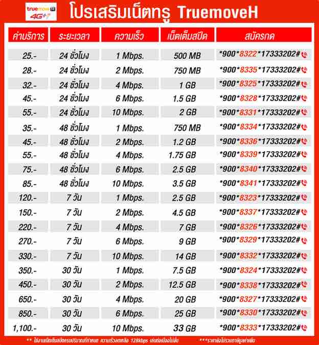 -โปรเน็ตทรู 850 บาท 30 วัน ความเร็วสูงสุด 6Mbps ใช้ได้ 25GB (ครบปริมาณ ใช้ต่อเนื่องที่ความเร็ว 128Kbps) สมัครกด *900*8330*17333202# 📞