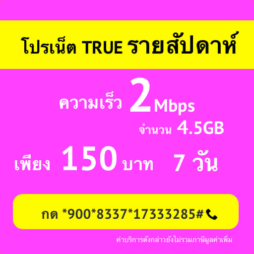 โปรเน็ต TRUE 2Mbps 7 วัน 1 สัปดาห์ ค่าบริการ เพียง 150 บาท 4.5GB สมัครกด *900*8337*17333285#โทรออก