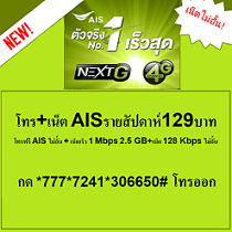 โปริมเสริม AIS ราคา 129 บาท 7 วัน เหมา เหมา คอมโบ สมัครกด *777*7220*306650# โทรออก รายละเอียด -โทรฟรี ใน เครือข่าย AIS ไม่อั้น 24 ชั่วโมง -ใช้งาน อินเทอร์เน็ต AIS 4G/3G ความเร็วสูงสุด 1 Mbps ไม่อั้น -ระยะเวลาการใช้งานนาน 1 สัปดาห์ หรือ 7 วัน -ราคา 129 บาท รวม Vat=138.03 บาท -สำหรับซิม AIS One 2 Call แบบเติมเงิน