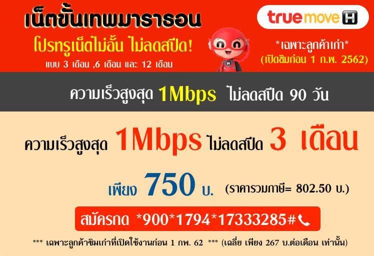 โปรเสริมเน็ตทรู 3 เดือน 750 บาท ไม่ลดสปีด ความเร็วสูงสุด 1 Mbps เล่นได้ไม่อั้น ระยะเวลาใช้งาน 90 วัน สมัครกด*900*1794*17333285#โทรออก .