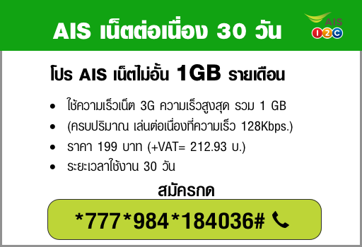 ✅ โปรเน็ต AIS รายเดือน 199 เล่นไม่อั้น(ต่ออายุอัตโนมัติ) โปรเน็ต AIS รายเดือน 199 บาท (รวมภาษี 213 บ.) เล่นเน็ตความเร็วสูงสุดของ AIS ได้ปริมาณเน็ตจำนวน 1GBระยะเวลาใช้งาน 30 วัน แต่ถ้าใช้เน็ตปริมาณครบ1GB หมดแล้วจะสามารถเล่นเน็ตต่อได้ที่ความเร็ว 128kbps จนครบ 30 วัน ต่ออายุอัตโนมัติ รายละเอียด: -ได้ใช้เน็ตความเร็วสูงสุดของ AIS ได้ปริมาณเน็ตจำนวน 1GB -เมื่อครบ 1GB ใช้ต่อเนื่องที่ความเร็วลดลงเหลือ 128Kbps แล้วใช้ต่อเนื่องไม่จำปริมาณจนครบเวลา 30 วัน -ราคารวมภาษี 213 บาทต่อเดือน -สมัครได้ทั้งลูกค้าเก่าและใหม่ AIS วันทูคอล -ต่ออายุอัตโนมัติ รหัสกดสมัคร *777*984*184036#☎️
