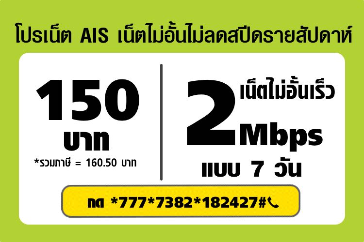 สมัครเน็ต AIS ราคา 150 บาท 7 วัน เน็ตไม่ลดสปีด สมัครกด *777*7382*182427# โทรออก รายละเอียด -เล่นเน็ต AIS 4G/3G ไม่ลดสปีด เล่นไม่จำกัด ความเร็ว 2mbps นาน 7 วัน -ใช้งานนาน 7 วัน -ราคา 150 บาท รวมภาษี = 160.50 บาท -สมัครได้ทุกซิมทั้งซิมใหม่ และ ซิมเก่า AIS 12Call