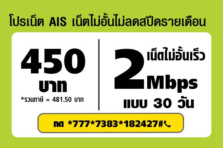 สมัครเน็ต AIS ราคา 450 บาท 30 วัน เน็ตไม่ลดสปีด สมัครกด *777*7383*182427# โทรออก รายละเอียด -เล่นเน็ต AIS 4G/3G ไม่ลดสปีด เล่นไม่จำกัด ความเร็ว 2mbps นาน 30 วัน -ใช้งานนาน 30 วัน -ราคา 450 บาท รวมภาษี = 481.50 บาท -สมัครได้ทุกซิมทั้งซิมใหม่ และ ซิมเก่า AIS 12Call