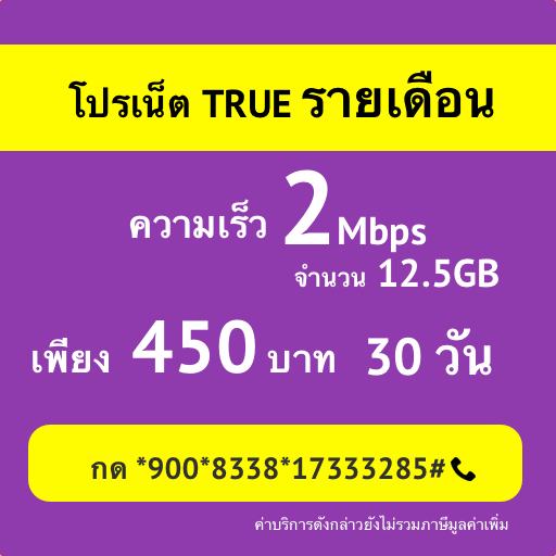 โปรเน็ต TRUE 2 Mbps 1 เดือน 30 วัน ค่าบริการ เพียง 450 บาท 12.5GB สมัครกด *900*8338*17333285#โทรออก