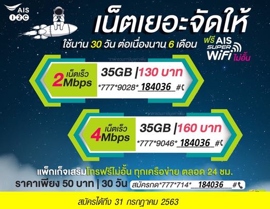 💥 โปรเน็ต AIS ความเร็ว 2Mbps | ใช้งานเน็ตได้ 35GB ✨ ราคาเพียง 130 บาท | 30 วัน ✨ ฟรี WiFi ไม่อั้น สมัครโปรกด *777*9028*184036# โทรออก