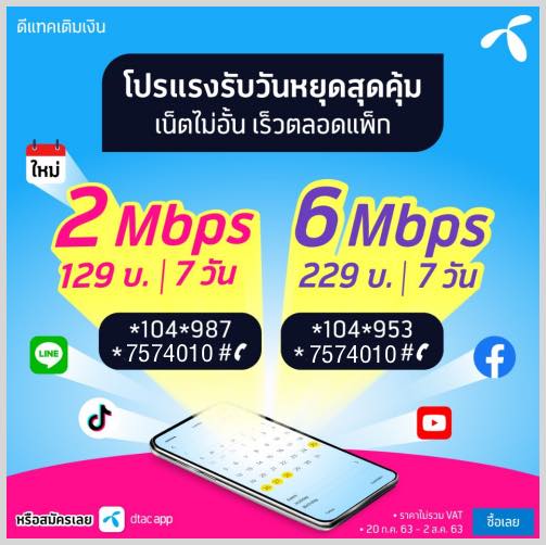 โปรเน็ต DTAC รายสัปดาห์ ความเร็ว 6Mbps ราคาพิเศษ! เพียง 229 บาท ไม่อั้นไม่ลดสปีดเล่นเน็ตยาวๆ 7 วัน