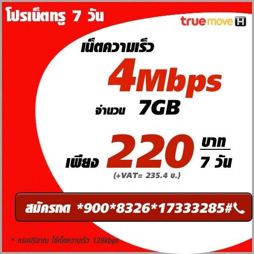 โปรเน็ต TRUE ทรูมูฟเอซ 7 วัน 1 สัปดาห์ ควาเร็วสูงสุด 4 Mbps 7GB สมัครได้ทั่งซิมเก่า และ ซิมใหม่ ค่าบริการเพียง 220 บาท ( รวมภาษี 235.40 บาท ) สมัครกด *900*8326*17333285#โทรออก ใช้เต็มปริมาณความลดเหลือ 128Kbps ( ใช้ซิมแบบเติมเงิน )สมัครได้เลย